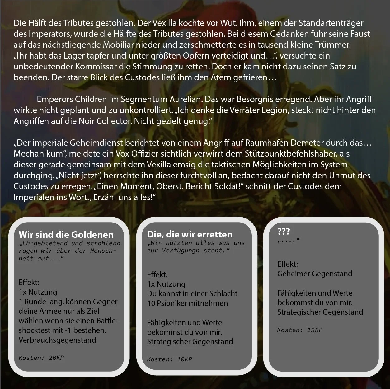 “Die Geburtsstunde eines Köngs”, war eine narrative Kurzkampagne bei uns im Gamers Finest Salzburg. Sechs tapfere Streiter haben sich im Segmentum Aurelian eingefunden und kämpften um die Vorherrschaft und Ruhm. Hier möchten wir euch ein paar ausgewählte Fotos und die Geschichte kurz zusammenfassen. Viel Spaß beim Bilder betrachten und lesen! Happy wargaming im Tabletop Salzburg. Euer Gamers Finest